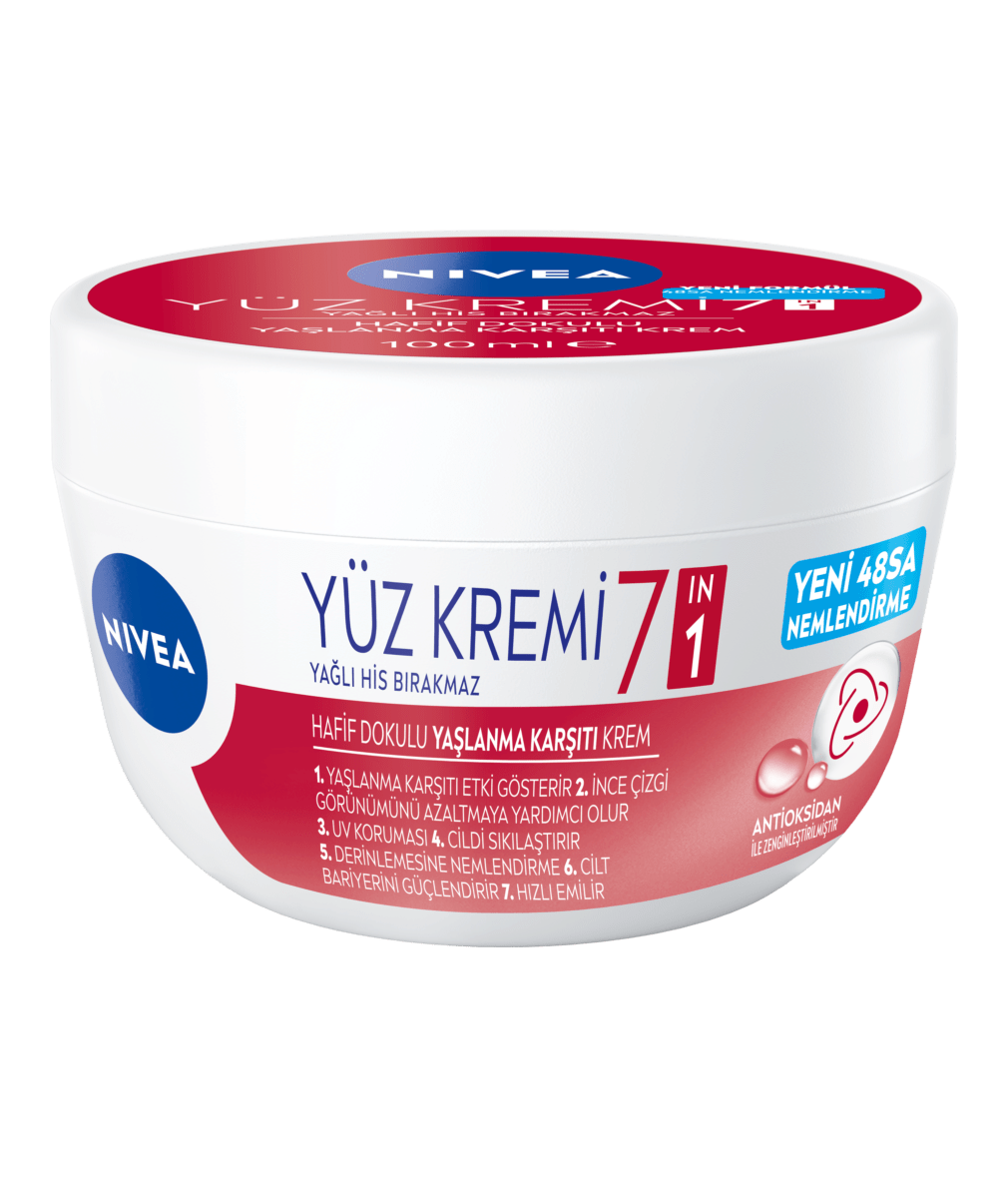 NIVEA 7si1 Arada Yaşlanma Karşıtı Yüz Kremi, antiokisdan içeren formülü ile yağlı his bırakmadan cildi nemlendirir ve yaşlanma karşıtı etki gösterir.