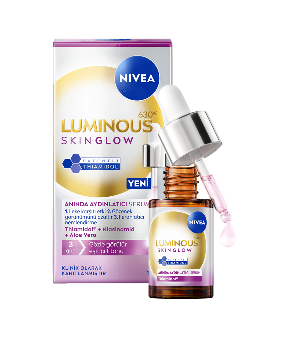 Çığır açan THIAMIDOL, Niasinamid ve Aloe Vera içeren Yeni NIVEA Luminous630 Skin Glow Anında Aydınlatıcı Serum ile 3 boyutlu parlaklığa kavuşun: 1.Eşit cilt tonu 2. Azalmış gözenek görünümü 3. Ferahlatıcı Nemlendirme